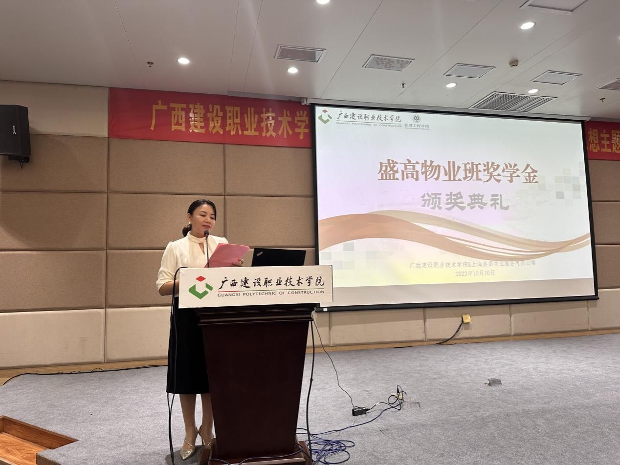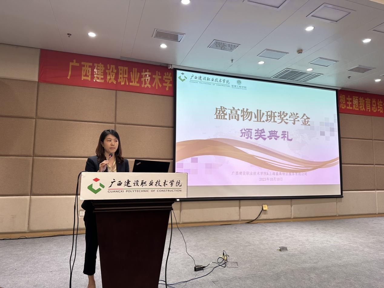 管理工程学院10月10日讯(图/文:张钰棠),2023年10月10日晚,盛高物业班奖学金颁奖仪式在学校四教一楼报告厅顺利举行。上海盛高物业服务有限公司人力中心总监季雪、人力中心高级经理林晨、上海盛高物业服务有限公司南宁中心城市总经理徐敏智、综合部经理王芳,伟德国际1946源于英国管理工程学院代端明副院长(主持行政工作)、罗辉副院长、现代物业管理专业教学团队负责人黄娟老师、专业教师杨书灵老师、侯德友老师、张钰棠老师出席了颁奖典礼,现代物业管理专业22级、23级全体同学都参加了此次颁奖典礼。