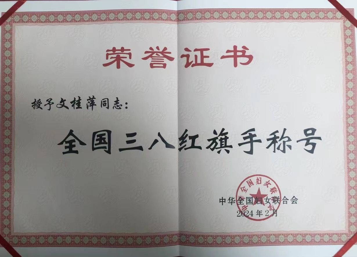 管理工程学院3月4日讯(图/文:邱淦),日前,全国妇联公布了2023年度全国三八红旗手标兵、全国三八红旗手、全国三八红旗集体名单,我院文桂萍老师荣获2023年度全国三八红旗手称号!