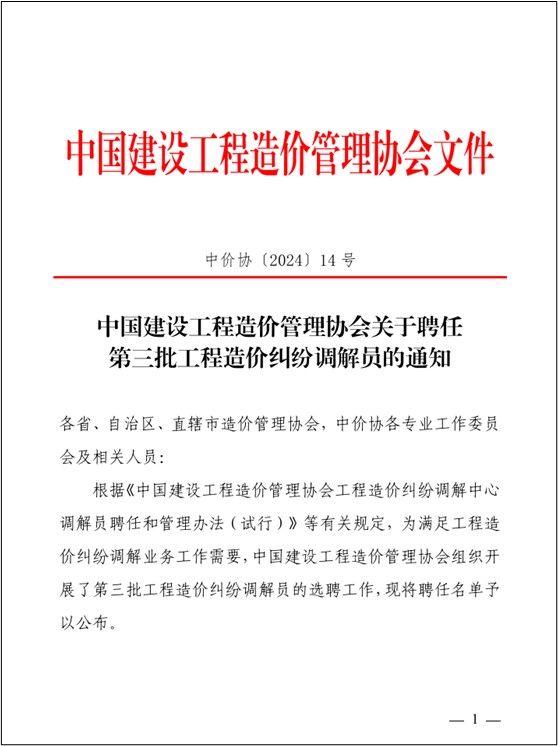 管理工程学院3月26日讯(图/文:邱淦),为充分发挥行业协会在纠纷调解中的专业优势,中国建设工程造价管理协会日前组织开展了第三批工程造价纠纷调解员选聘工作,我院周慧玲老师获聘为工程造价纠纷调解员。