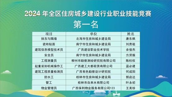 据悉,本次全区住房城乡建设行业职业技能竞赛是为了贯彻党的二十大和党的二十届三中全会精神及习近平总书记关于技能人才工作的重要指示精神,围绕自治区总工会“桂有技能、产业振兴”劳动和技能竞赛的有关要求而举办的,为全区住房城乡建设系统技能人才成长搭建了平台,实现“桂有技能、产业振兴”,助力住房城乡建设事业高质量发展。