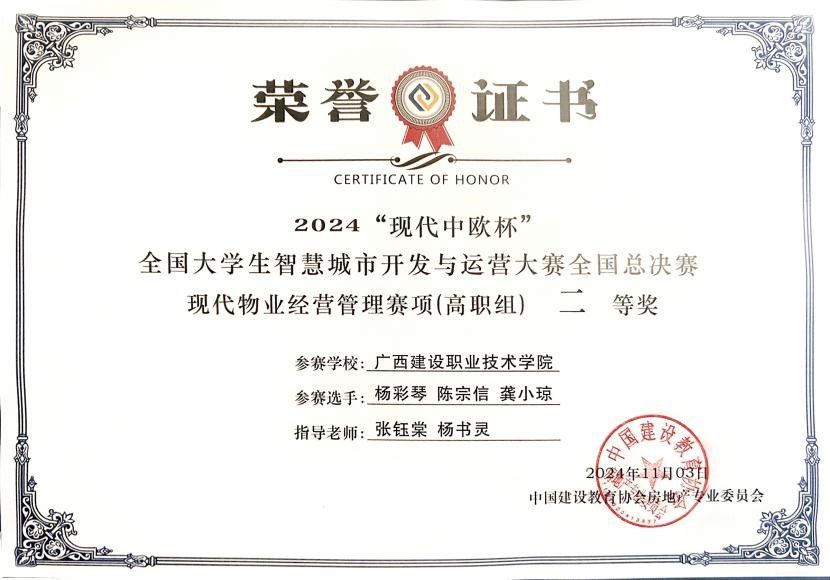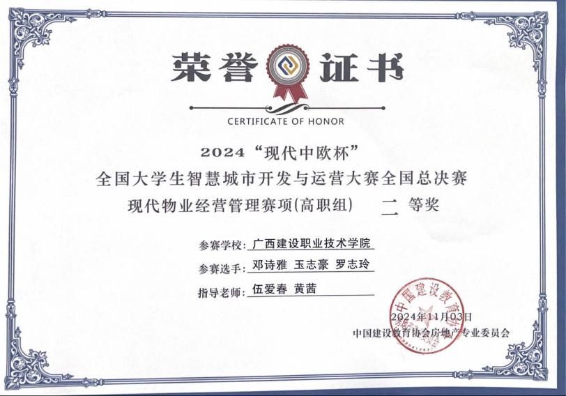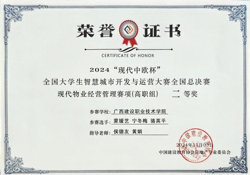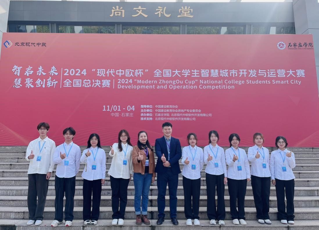 管理工程学院11月5日讯(图/文:侯德友),2024年11月3日,由中国建设教育协会指导、中国建设教育协会房地产专业委员会主办、石家庄学院和北京现代中欧软件开发有限公司联合承办的2024“现代中欧杯”全国大学生智慧城市开发运营大赛全国总决赛在石家庄学院成功举办。经过激烈角逐,由我院现代物业管理专业9位学生组成的三支队伍均获得现代物业经营管理赛项(高职组)二等奖。