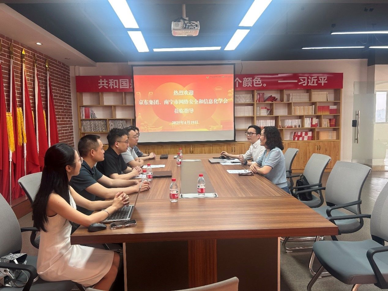 管理工程学院4月20日讯(图、文:肖大勇)4月19日上午,京东物流教育副总经理王精一,京东物流教育解决方案负责人陈燕燕,京东物流教育广西区域负责人吴小恒以及南宁市网络安全和信息化学会党支部书记、副会长兼秘书长毛宁,副秘书长邓耀文一行到管理工程学院进行调研交流。管理工程学院副院长杨书灵、智慧物流团队(筹)教师肖大勇参加座谈。