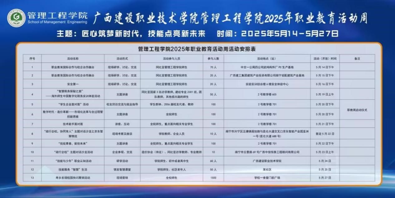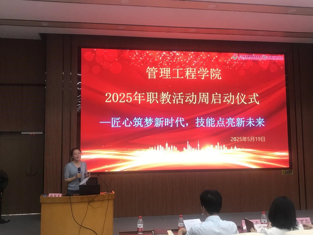 管理工程学院5月20日讯(图/文:黄燕飞)2025年5月19日下午,2025年管理工程学院“匠心筑梦新时代,技能点亮新未来”职教活动周启动仪式在学院隆重举行。广联达科技股份有限公司产品总监张玲玲、广西瑞承工程造价咨询有限公司总经理农友平、广西八桂建设项目管理有限公司一分公司负责人唐百合等校企合作代表,以及管理工程学院领导班子、各专业师生代表齐聚一堂,共同开启为期14天的职业教育盛宴。