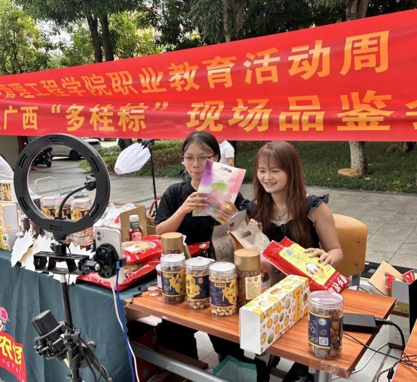 1.社区与校园互动:联合广西寿乡农场举办校园快闪展销会,学生通过场景化营销实践,不仅提升了产品推广与客户服务能力,更直观展现了职业教育服务乡村振兴的成果。现场同步开展的直播营销活动,进一步凸显了“互联网+职业教育”的创新实践。