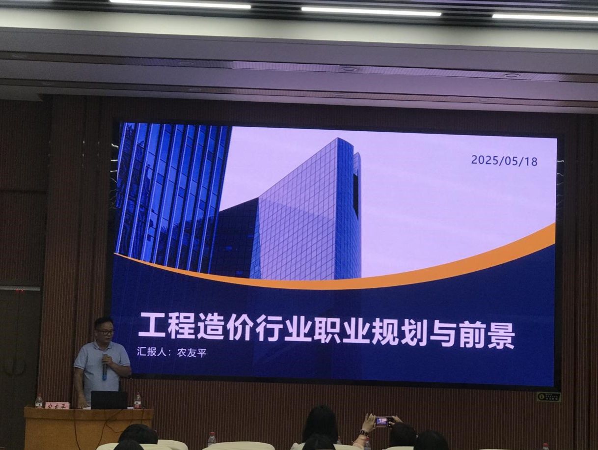 2.校企合作深化:组织“政行企校”主题对话沙龙,师生走进京东智能产业园亚洲一号、中交一公局四公司等企业,围绕人才培养与实习就业展开深度交流;邀请广西瑞承工程造价咨询有限公司总经理农友平等校友回校开展职业规划讲座,为学生提供“过来人”的实战经验,助力职业认知升级。