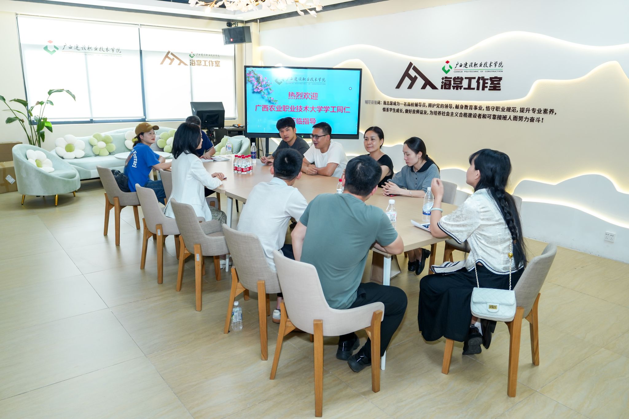 刘益明副书记表示,海棠工作室以学生和辅导员为双主体,在构建“师生成长共同体”方面取得了优异成绩,起到了示范作用,有力推动辅导员团队专业化、职业化、专家化建设。在辅导员工作室建设示范性经验方面,提供了“新思路、新模式、新探索”,希望海棠工作室对广西农业职业技术大学人文与艺术学院辅导员工作室培育创建等方面给予支持和帮助,共同在项目培育、团队建设等方面作出新探索。双方还深入探讨了辅导员工作室场地建设、队伍建设、经费支持、活动开展等问题。