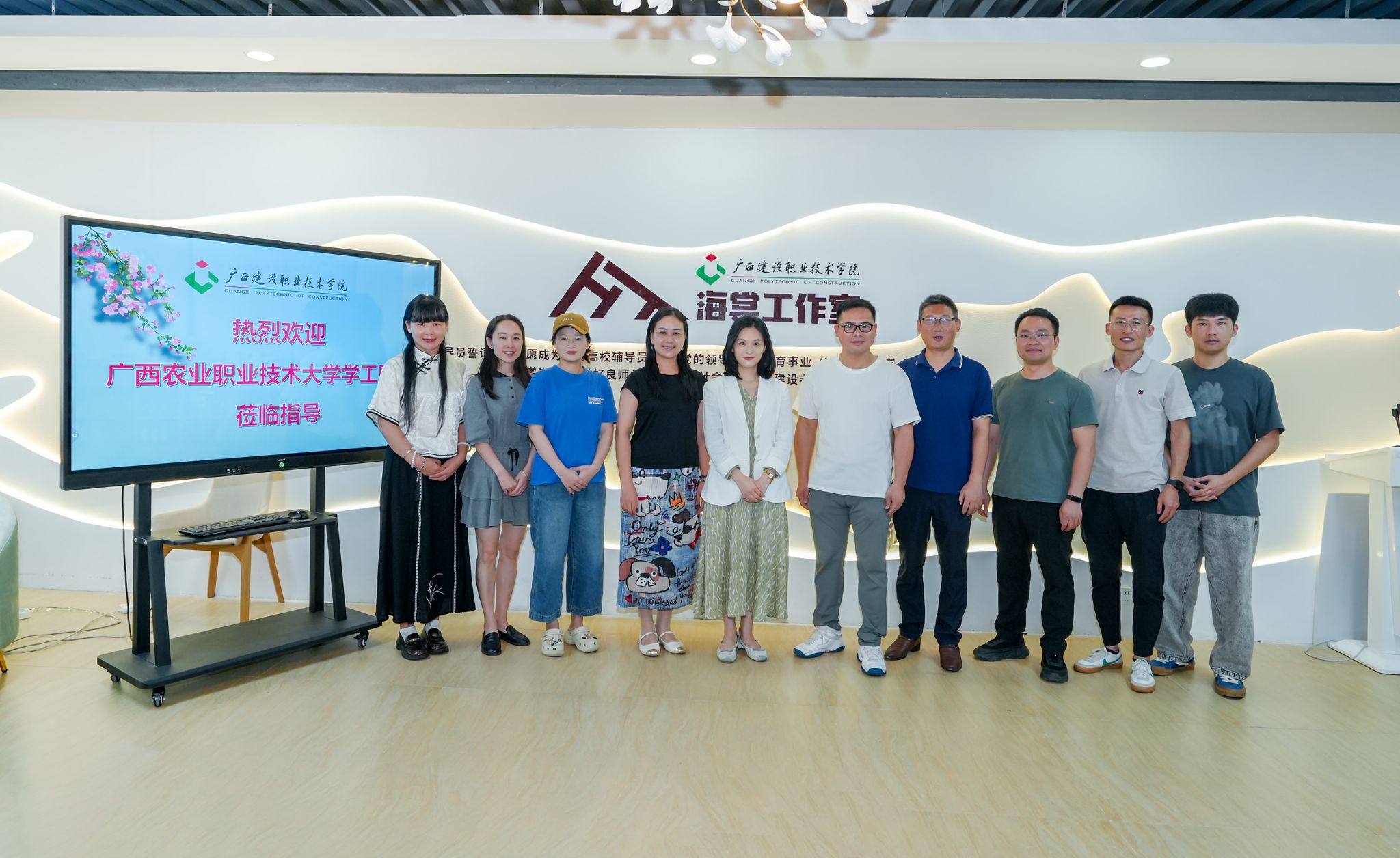 管理工程学院6月27日讯(文/孙文、图/宋景弘)近日,广西农业职业技术大学人文与艺术学院党委副书记刘益明一行9人到我院交流辅导员工作室建设培育工作。管理工程学院党总支副书记、海棠工作室主持人郭海棠及工作室成员代表参加交流座谈。