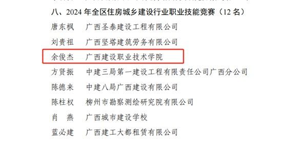 管理工程学院6月28日讯(图/文:吴彩竹)日前,广西壮族自治区人力资源和社会保障厅发布了《关于授予2024年度自治区级职业技能竞赛优秀选手“广西技术能手”称号的决定》,我院教师余俊杰凭借其在建筑信息模型(BIM)领域高超的技术水平,荣获“广西技术能手”称号。这一省级荣誉是对他个人技术能力的高度肯定,也是对我院相关专业领域教学与实践成果的充分认可。