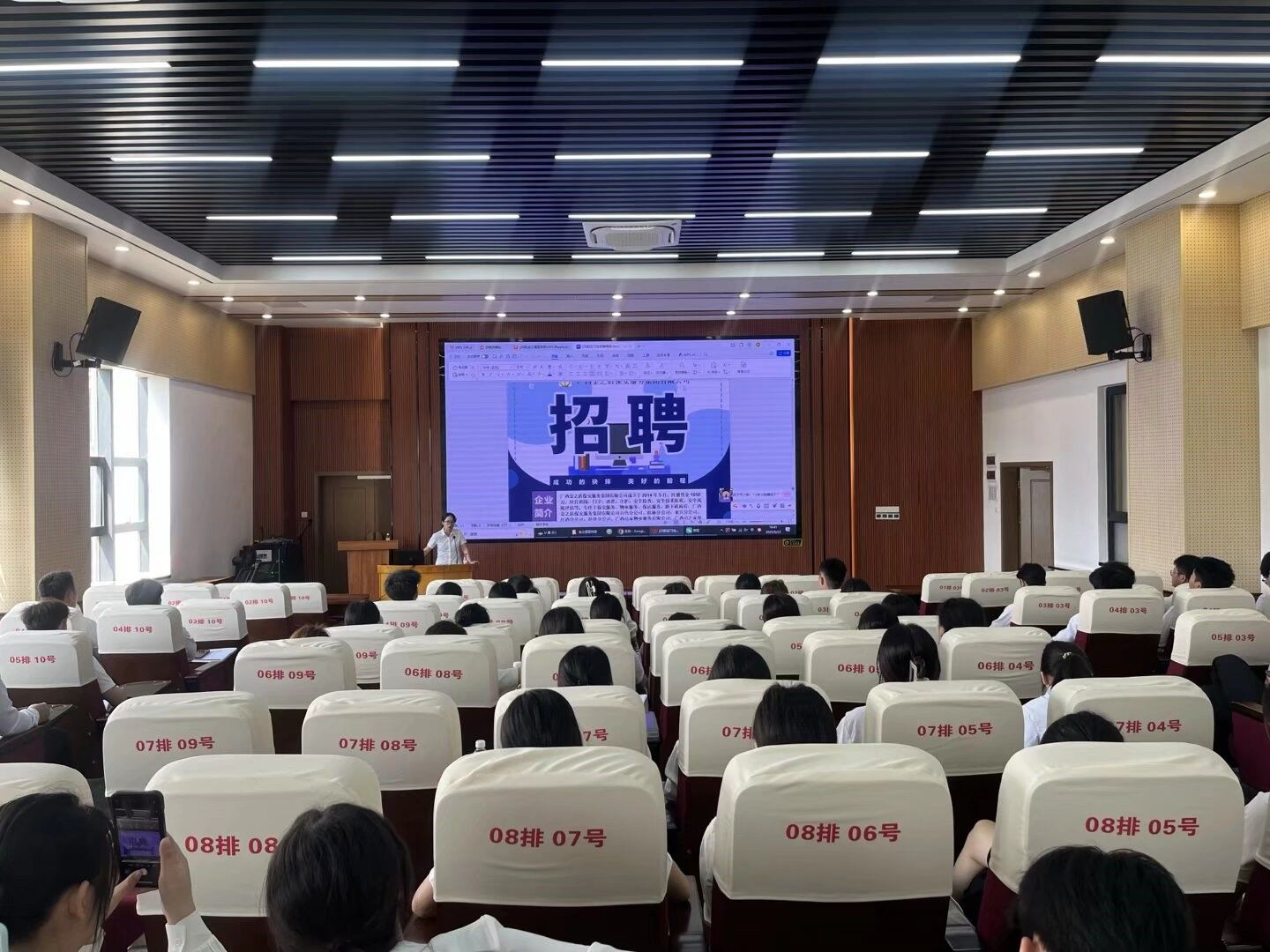 当日上午,2号教学楼701教室开启物业专场宣讲。万物云旗下深圳市万御安防科技服务有限公司、广西金之盾保安服务集团有限公司先后登台,通过企业宣传片、业务解读、岗位需求说明等形式,向学生详解行业发展趋势与职业成长路径。其中,万御安防重点介绍了其科技安防、机电维保等核心业务,以及全国60余座城市3000余个服务项目的布局规模;广西金之盾则聚焦安防服务实操与岗位能力要求,为学生搭建起行业认知桥梁。