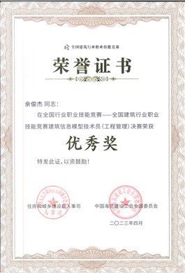 余俊杰老师获2023年全国建筑业行业职业技能竞赛建筑信息模型优秀奖