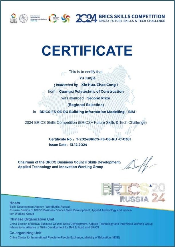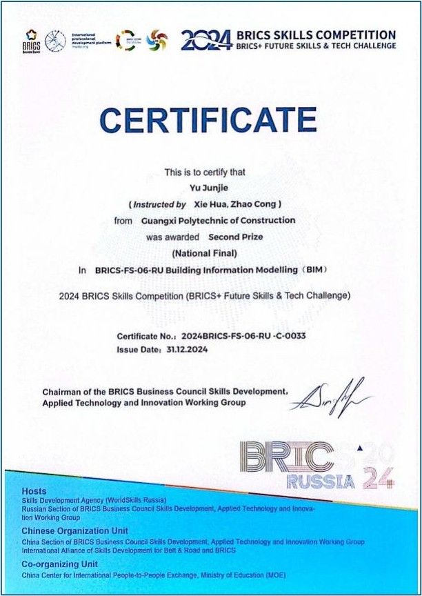 余俊杰老师获2024金砖国家职业技能大赛建筑信息建模赛区域选拔赛二等奖、国内决赛二等奖