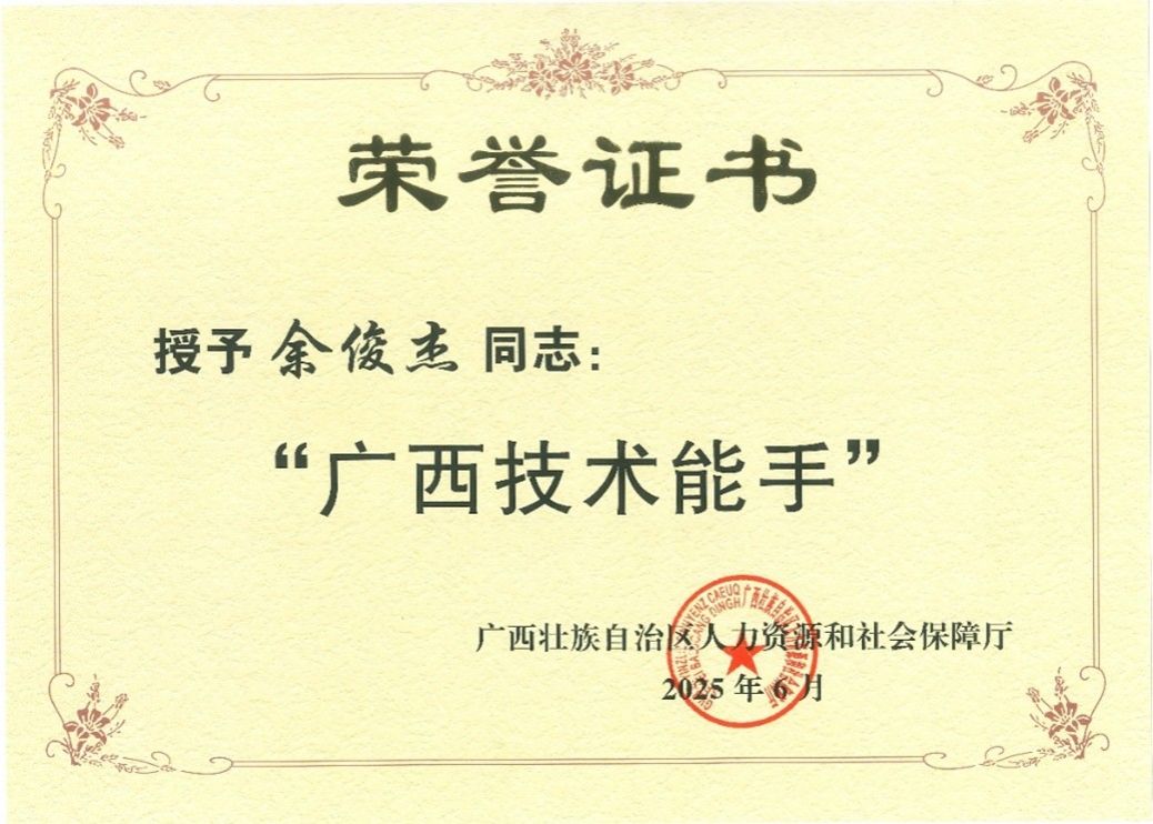 一年之内,连拿多项国家级荣誉,2025年被自治区人力资源和社会保障厅授予“广西技术能手”称号。