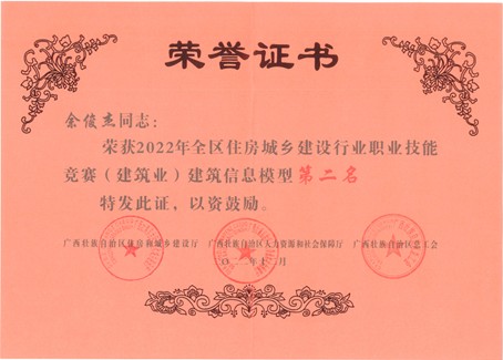 余俊杰老师获2022年全区建设业行业职业技能竞赛建筑信息模型第二名