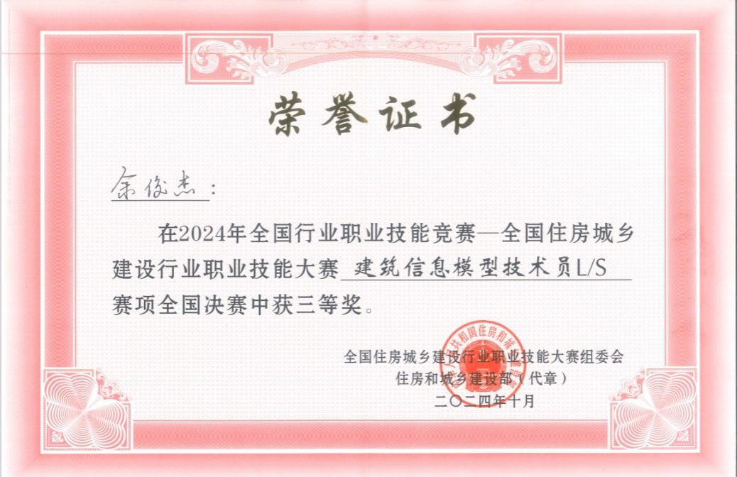 余俊杰老师获2024年全国建筑业行业职业技能竞赛建筑信息模型三等奖