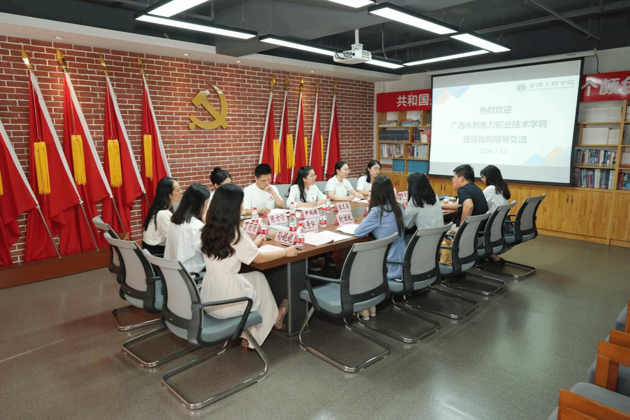 管理工程学院7月14日讯(图:宋景弘,文:黄春)7月13日,广西水利电力职业技术学院经济管理学院党总支书记班兰美一行8人到我院就党建“双创”工作经验、辅导员工作室建设、“一站式”学生社区建设参观交流,学院党总支副书记郭海棠主持交流会。