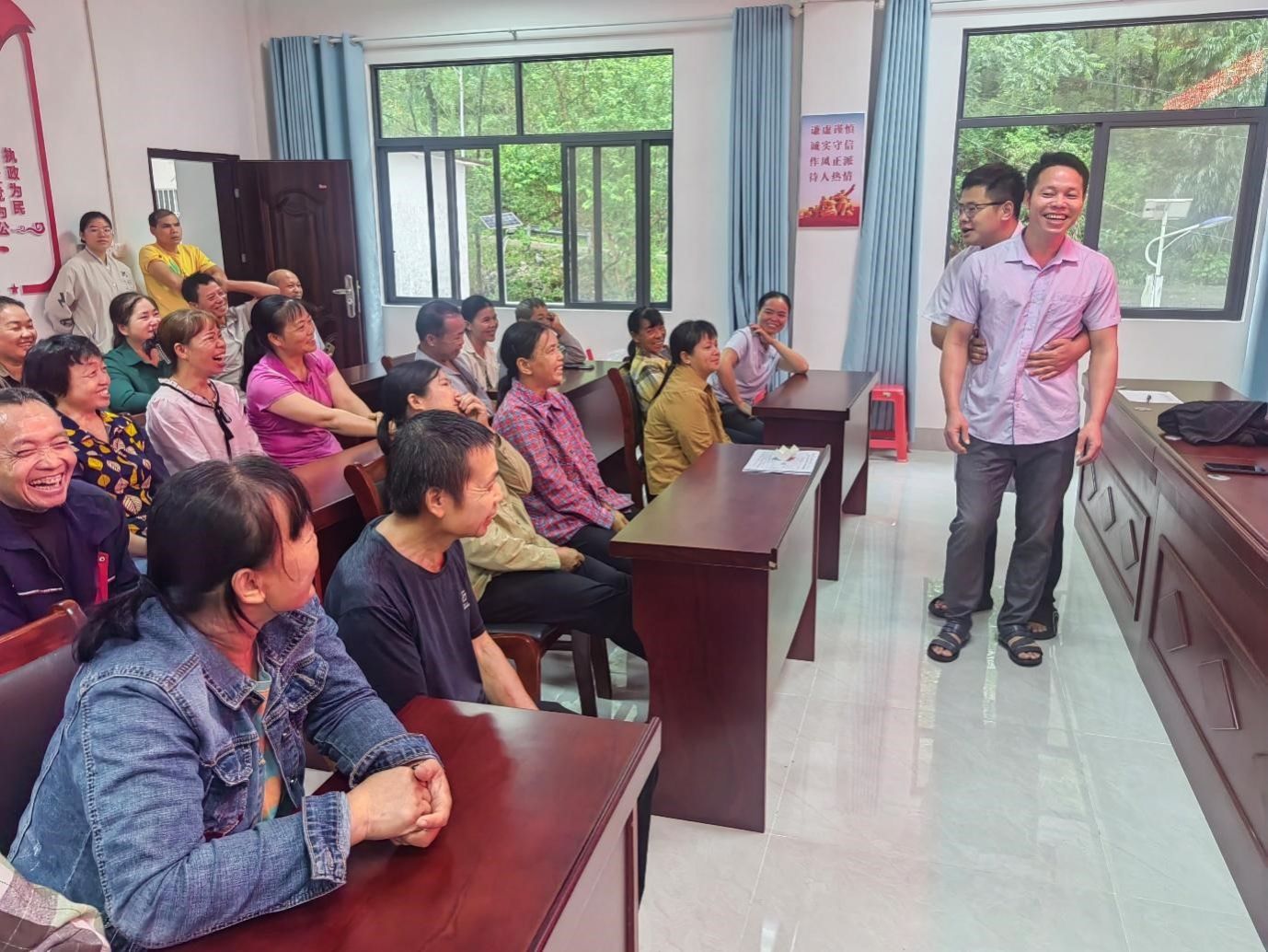随后进行了海姆立克急救法教学环节。村医采用了“真人实景”的互动教学方式。他热情邀请一位村民上前充当“模拟患者”,一边用方言亲切地解释“剪刀、石头、布”等定位口诀,一边在村民身上从容不迫地演示标准动作——如何快速判断情况、如何站稳脚跟、如何找准上腹部位置、又如何用巧劲向内向上冲击。村民们看得目不转睛,不时发出阵阵惊叹。当“患者”配合做出成功吐出异物的动作时,现场响起一片会意的笑声和掌声。这种“身边人演身边事”的讲法,把关键技能化繁为简,让急救知识真正“活”了起来,入脑又入心。