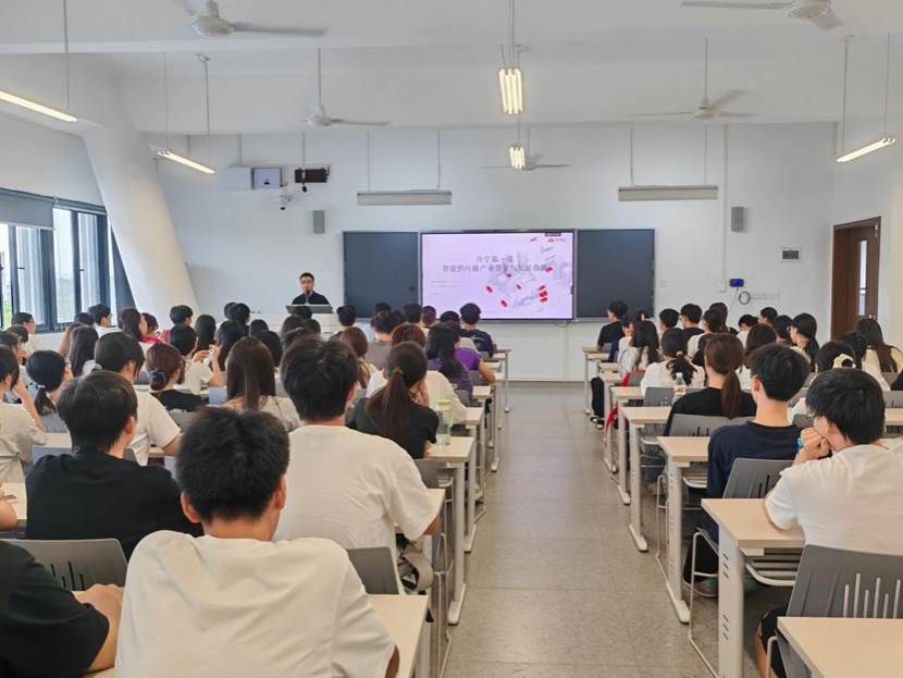 管理工程学院923日讯(图/文:肖大勇),为帮助2025级新生快速了解智能物流技术专业定位、明晰行业发展方向,2025918日,智能物流技术专业20253个班级的新生专业教育课在武鸣校区顺利开展。本次课程由管理工程学院副院长、智慧物流教学团队带头人杨书灵主持,智慧物流教学团队肖大勇、梁国赏、李红三位老师共同出席,并特邀京东物流教育公司副总经理王精一担任主讲嘉宾,为刚迈入专业学习的新生带来一堂兼具行业深度与实践温度的启蒙课程。