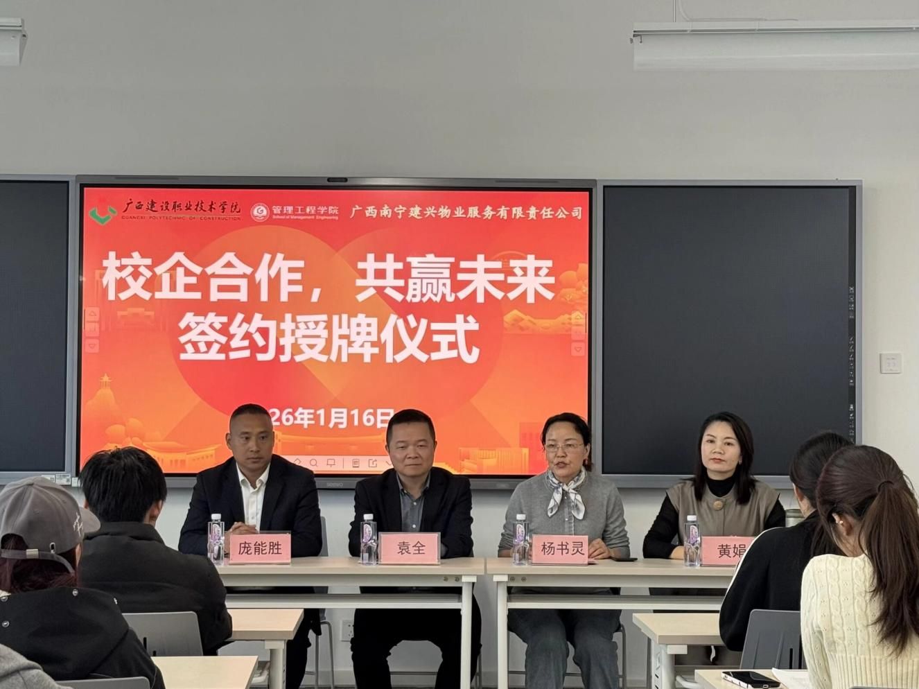 2026年1月16日,伟德国际1946源于英国管理工程学院与广西南宁建兴物业服务有限责任公司(以下简称“建兴物业”)校企合作签约授牌仪式在武鸣校区隆重举行。建兴物业总经理袁全、副总经理庞能胜一行及学院副院长杨书灵、专业负责人黄娟、管理工程学院师生代表共同出席仪式,见证双方开启协同育人新篇章。
