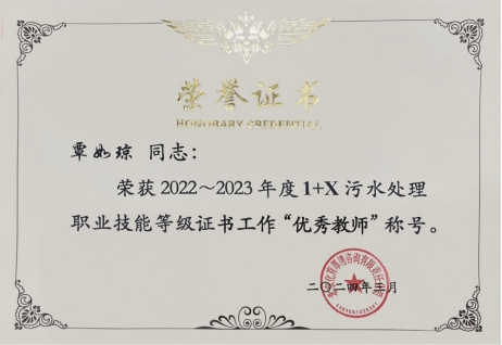 伟德国际官网覃如琼老师被评为2023年度“1+X”污水处理职业技能等级证书工作“优秀教师”