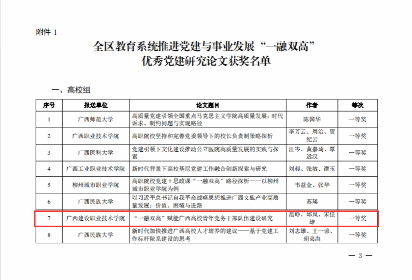 据悉,本次“一融双高”优秀党建研究论文评选旨在挖掘和推广全区教育系统在党建与事业发展融合方面的优秀研究成果,经过严格评审,共评选出高校优秀党建研究论文40篇,其中一等奖12篇。这项荣誉的获得,不仅是学校党建研究工作的一次重要突破,也是上级对我校党建与事业发展融合方面所取得成绩的充分肯定。下一步,学校将持续坚持以习近平新时代中国特色社会主义思想为指导,聚焦党建与事业发展“一融双高”重点难点问题,扎实开展党建工作理论研究,为学校高质量发展提供坚强政治保障。