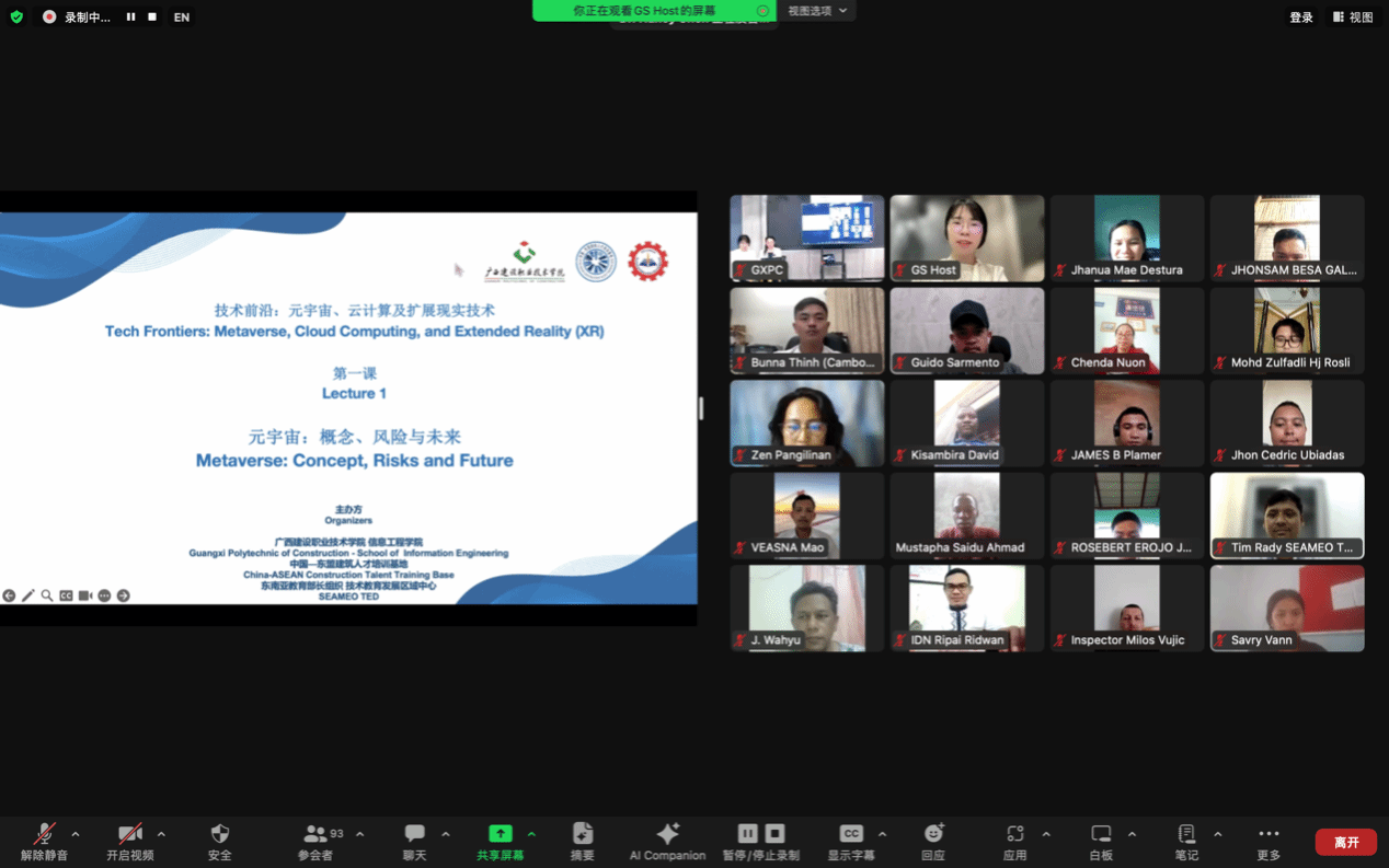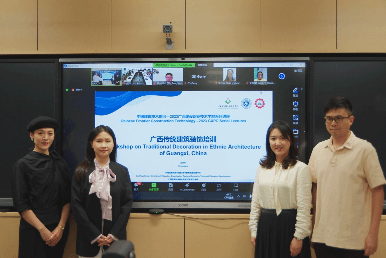 学校与东南亚教育部长组织技术教育发展区域中心联合举办了面向东盟的2个专题共6场线上培训。其中,学校艺术设计学院的3位教师以“广西侗族传统建筑装饰”为主题,向东盟师生做了《广西传统建筑解析与传承》《广西地域文化在现代室内装饰设计中的应用》《广西传统装饰与现代室内装饰工艺的结合》等三场分享;学校信息工程学院3名青年教师聚焦科技前沿,分别以《元宇宙:概念、风险与未来》《云计算入门:服务类型、关键技术、部署模式》《扩展现实(XR)技术在建筑与室内相关领域中的应用》为题做专题培训。老师在授课期间,全程使用英语向海外学生、学者与行业从业人员进行授课和答疑,吸引了约660人次参与。这两个系列课程充分展示了学校教育贴近行业发展前沿和立足广西优势特色,探索创新教学模式,持续深化国际影响力提升,面向东盟打造“建院职教”品牌,提升中国职教的魅力。