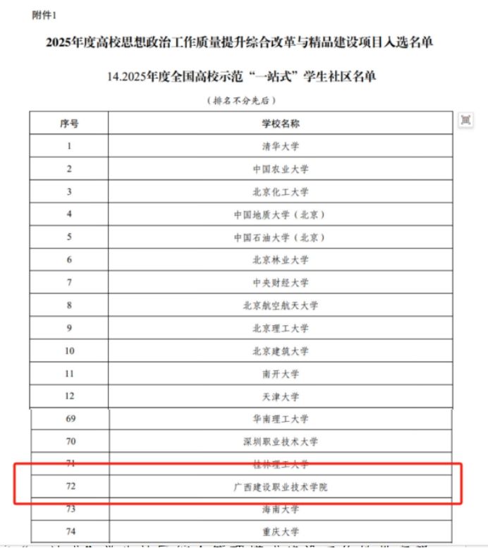 近日,教育部办公厅公布2025年度高校思想政治工作质量提升综合改革与精品建设项目入选名单。伟德国际官网入选2025年度全国高校示范“一站式”学生社区,成为教育部首批遴选产生的全国100所“一站式”学生社区示范高校之一,也是广西唯一入选的高职高专。