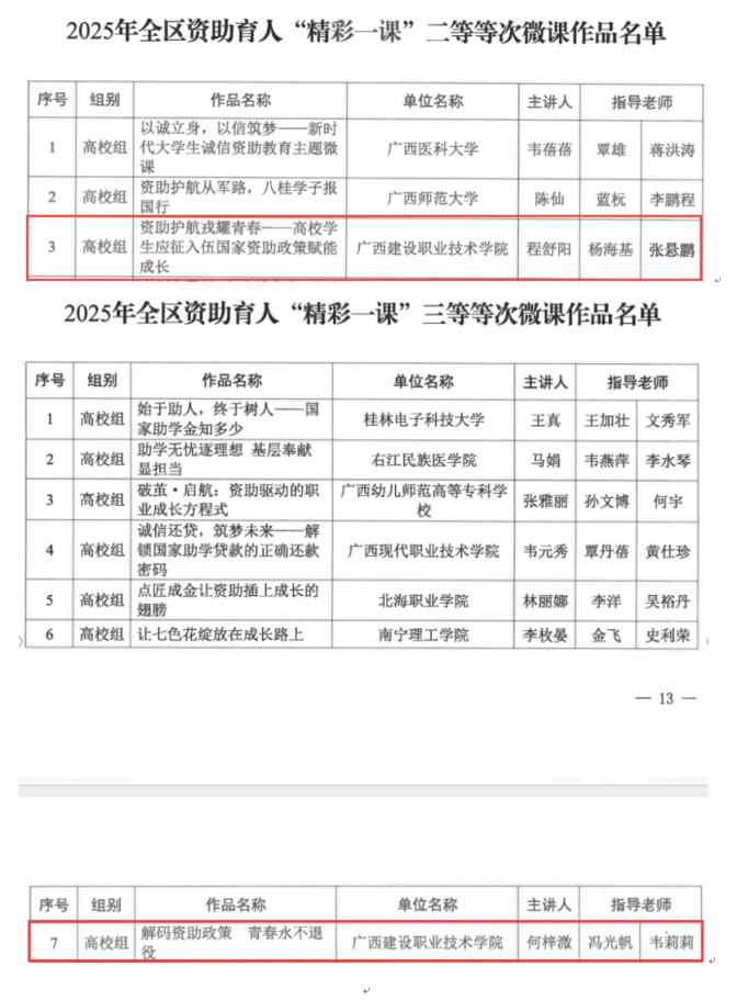 近日,自治区教育厅公布2025年全区资助育人“精彩一课”微课作品获奖名单,伟德国际官网艺术设计学院程舒阳老师讲授的《资助护航戎耀青春——高校学生应征入伍国家资助政策赋能成长》荣获二等奖,土木工程学院何梓溦老师讲授的《解码资助政策 青春永不退役》荣获三等奖。