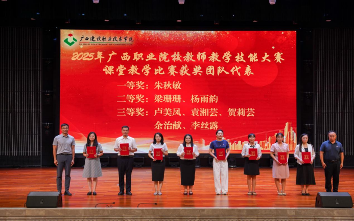 柏挺副校长和付春松副校长为2025年广西职业院校教师教学技能大赛课堂教学比赛获奖团队代表颁奖