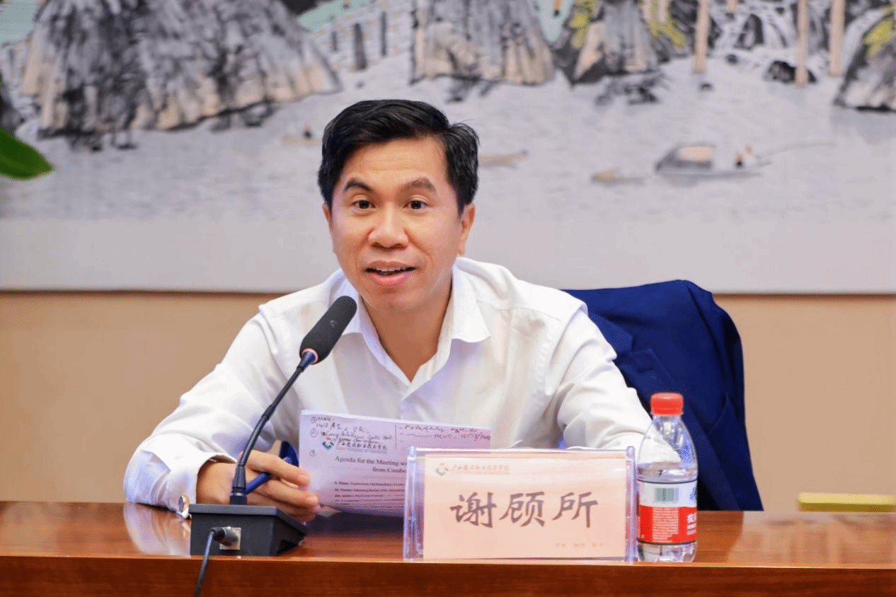 座谈会上,梁业胜校长代表学校对谢顾所和桑·拉塔纳一行在参加2025中国(广西)—东盟职业教育合作发展大会(以下简称“大会”)期间到访伟德国际官网表示热烈欢迎,并介绍了学校的办学历史、师资队伍建设及职业教育特色发展成效。他指出,学校高度重视国际化办学,尤其是通过两年的建设,中国—柬埔寨现代建筑工匠学院项目成效显著。为进一步深化中柬职业教育合作,他提出四点建议:一是积极落实此次职教大会发布的中国—东盟现代工匠学院升级版建设方案目标,持续推进中国—柬埔寨现代建筑工匠学院建设,联合柬埔寨国家技术培训学院及中柬建筑企业,以属地化人才实际需求为导向推进“校企协同”人才培养;二是主动拥抱AI+的人工智能赋能的职业教育合作,共建共享双语数字教学资源库,借助AI翻译工具破解语言沟通障碍,建设远程智慧教室,推广VR/AR仿真实训,将BIM技术、智能建造等数字技术纳入培训内容,助力双方建筑产业升级与教育现代化;三是搭建广西职业教育界与柬埔寨劳动与职业培训部的合作平台,积极推动合作备忘录签署与项目实施,并为广西院校开展对柬合作提供支持;四是拓展与柬埔寨高校的合作领域,积极推进学术交流、师生互访和人才联合培养,共同提升中柬建筑职业教育水平。