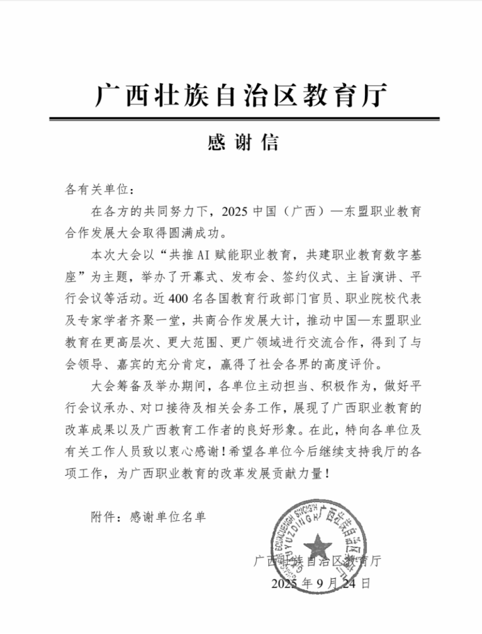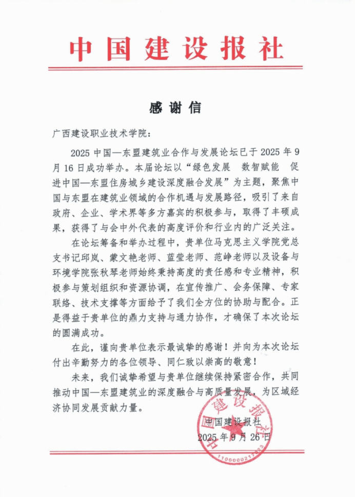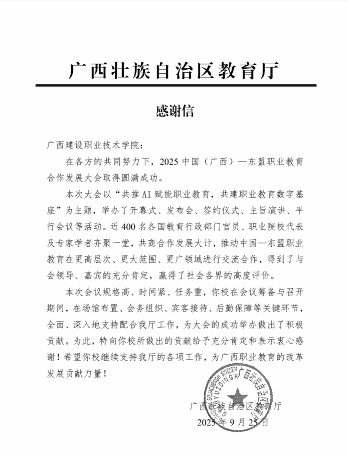 近日,伟德国际官网接连收到来自自治区教育厅和中国建设报社的三封感谢信,对学校在2025中国(广西)—东盟职业教育合作发展大会和2025中国—东盟建筑业合作与发展论坛筹备和召开期间,作出的积极贡献表示充分肯定与衷心感谢。