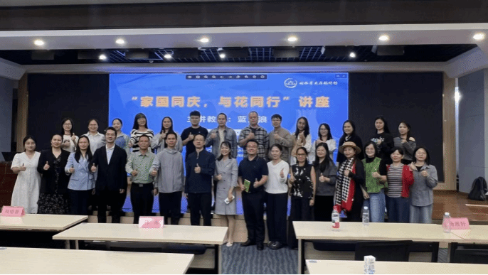 蓝海浪与参加“家国同庆 与花同行”主题讲座的领导、嘉宾和教师代表合影