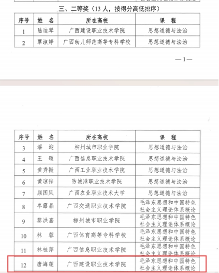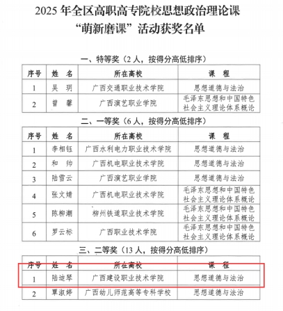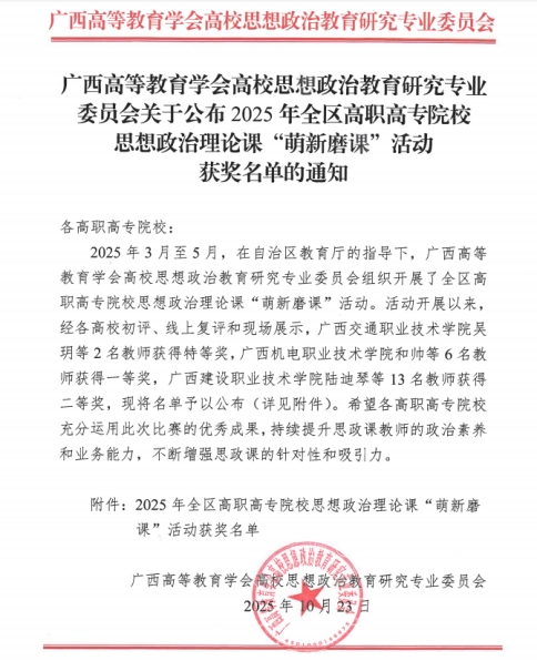 近日,2025年全区高职高专院校思想政治理论课“萌新磨课”活动获奖名单公布,伟德国际官网思政课教师陆迪琴、唐海莲荣获二等奖。