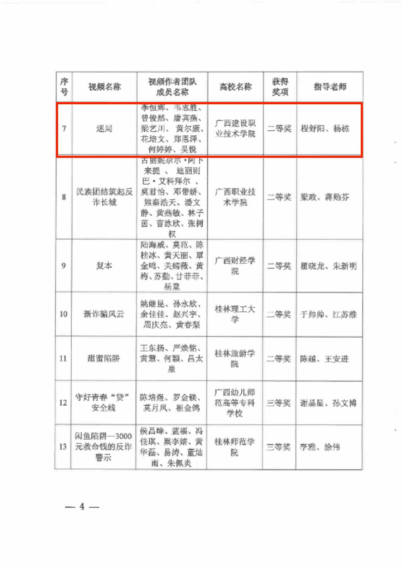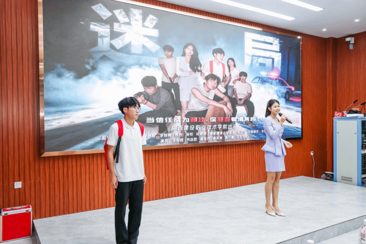 该作品由程舒阳、杨栋老师指导,李恒辉、韦志胜、曾俊然、唐宾燕、梁艺川、黄尔康、花培文、郑恩泽、何婷婷、吴悦同学共同创作完成。作品紧扣“筑牢青春防线,共筑诚信校园”主题,以大学生林墨的遭遇为主线,通过“街头试探”“三次交锋”“信任深渊”“黎明解救”四个层层递进的篇章,艺术化地呈现了诈骗陷阱的隐蔽性与复杂性,深刻揭示了在利益诱惑面前保持清醒、坚守诚信、筑牢思想防线的重要性。影片叙事流畅,悬念迭起,表演真挚,制作精良,生动诠释了新时代青年应有的警惕意识、辨别能力和价值坚守,最终从全区众多参赛作品中脱颖而出,获得佳绩。