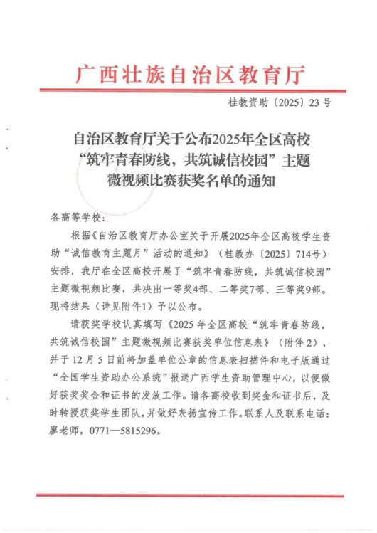 学校将以此次获奖为契机,进一步深化学生资助育人工作,持续加强校园诚信文化建设与安全教育,引导广大学生牢固树立诚信观念,增强法治意识和风险防范能力,自觉抵制各种诱惑与陷阱,共同营造风清气正、安全和谐的校园环境,助力每一位学生健康成长、全面发展。