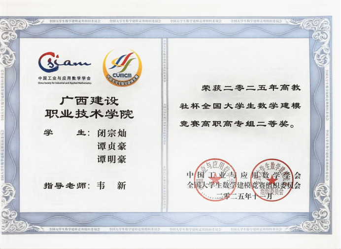 近日,2025年“高教社杯”全国大学生数学建模竞赛成绩揭晓,伟德国际官网学子谭贞豪、谭明豪、闭宗灿团队荣获全国二等奖。此前,在广西赛区选拔中,伟德国际官网参赛队伍与全区53所院校、1611支队伍同场竞技,共获得自治区二等奖1项、三等奖3项,韦新老师获评“广西区赛优秀指导教师”,学校获评“广西区赛优秀组织学校”。