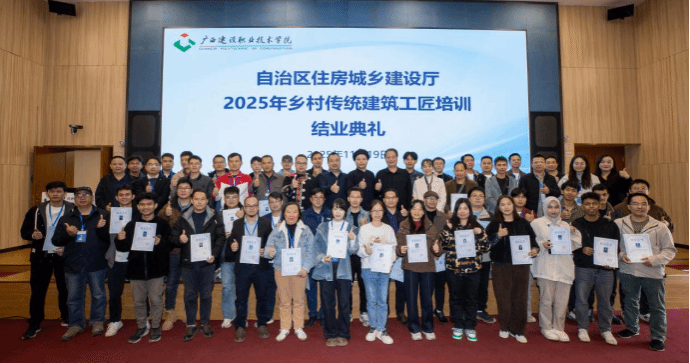 学院强化党建引领专业实践,依托专业优势主动服务区域发展大局,将党建工作与乡村振兴战略深度融合。精准对接行业与乡村需求,协助继续教育学院承办“2025年乡村传统建筑工匠培训”,并积极响应自治区住房城乡建设厅部署,组织教师赴钦州、河池、崇左等9个地市,开展“乡村建筑工匠培训”“AIGC驱动行业创新”等专题培训70余场,累计培训超6000人次,有效助力基层技术人员技能提升与行业数字化转型。