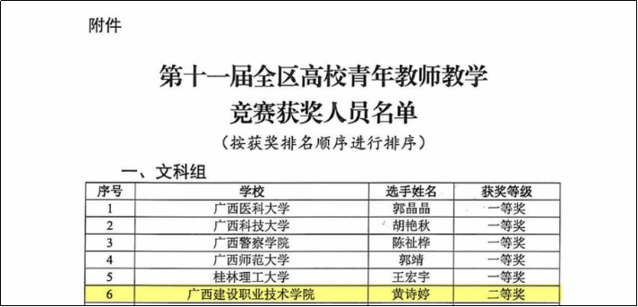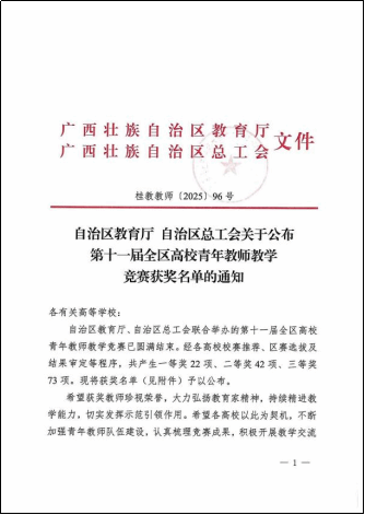 近日,由自治区教育厅、自治区总工会联合举办的第十一届全区高校青年教师教学竞赛圆满落幕。伟德国际官网参赛教师凭借扎实的教学基本功、创新的教学设计和精湛的课堂呈现,在全区众多参赛选手中脱颖而出,斩获一等奖1项、二等奖2项、三等奖1项,参赛教师全员获奖。其中,工科组詹雷颖老师成为本届所有一等奖获奖教师中唯一一位来自高职院校的教师。