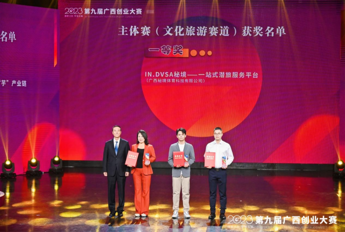 李峻宇(右二)公司项目荣获2023年第九届广西创业大赛主题赛(文化旅游赛道)一等奖