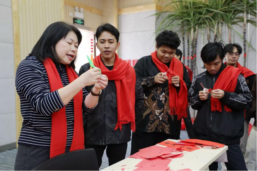 联欢会开始前,现场设置了体验中国传统文化的书写毛笔字和剪纸环节。留学生们在老师指导下提笔挥毫、巧手裁红,亲身感受中国年的独特韵味,为活动增添了浓厚的文化氛围。