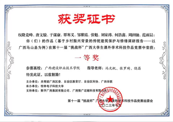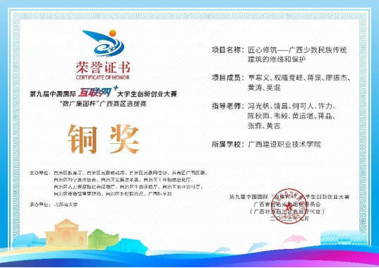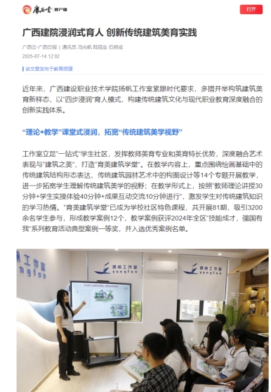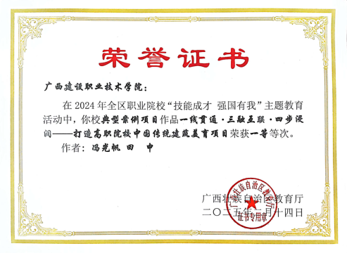 美育实践成果持续转化。深挖项目内涵,推动传统建筑的保护与修缮工作,建立传统建筑数据库,让学生在传承古建技艺中延续传统建筑文脉。实践成果获第十一届“挑战杯”广西大学生课外学术科技作品竞赛、广西青少年模拟政协提案征集活动三等奖等7项省部级荣誉、6项校级荣誉,项目获评自治区“技能成才 强国有我”典型案例一等次并入选全区优秀案例,申报课题“数字赋能广西传统建筑文化传承发展研究”获批2025广西中青年教师基础能力提升项目立项。