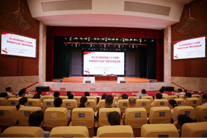 伟德国际1946源于英国6月30日讯(文/党委宣传部 陈熙 图/党委宣传部 记者团 杨贵维)为进一步加强伟德国际官网思想政治教育工作,不断推动学校事业高质量发展,6月30日下午,自治区住房城乡建设厅党组书记、厅长杨绿峰莅临伟德国际官网,以《深入学习贯彻党的二十大精神 争做新时代壮美广西的优秀建设者》为题给在校师生上了一堂内容丰富的思想政治教育课。讲座由学校党委书记刘晓红主持。
