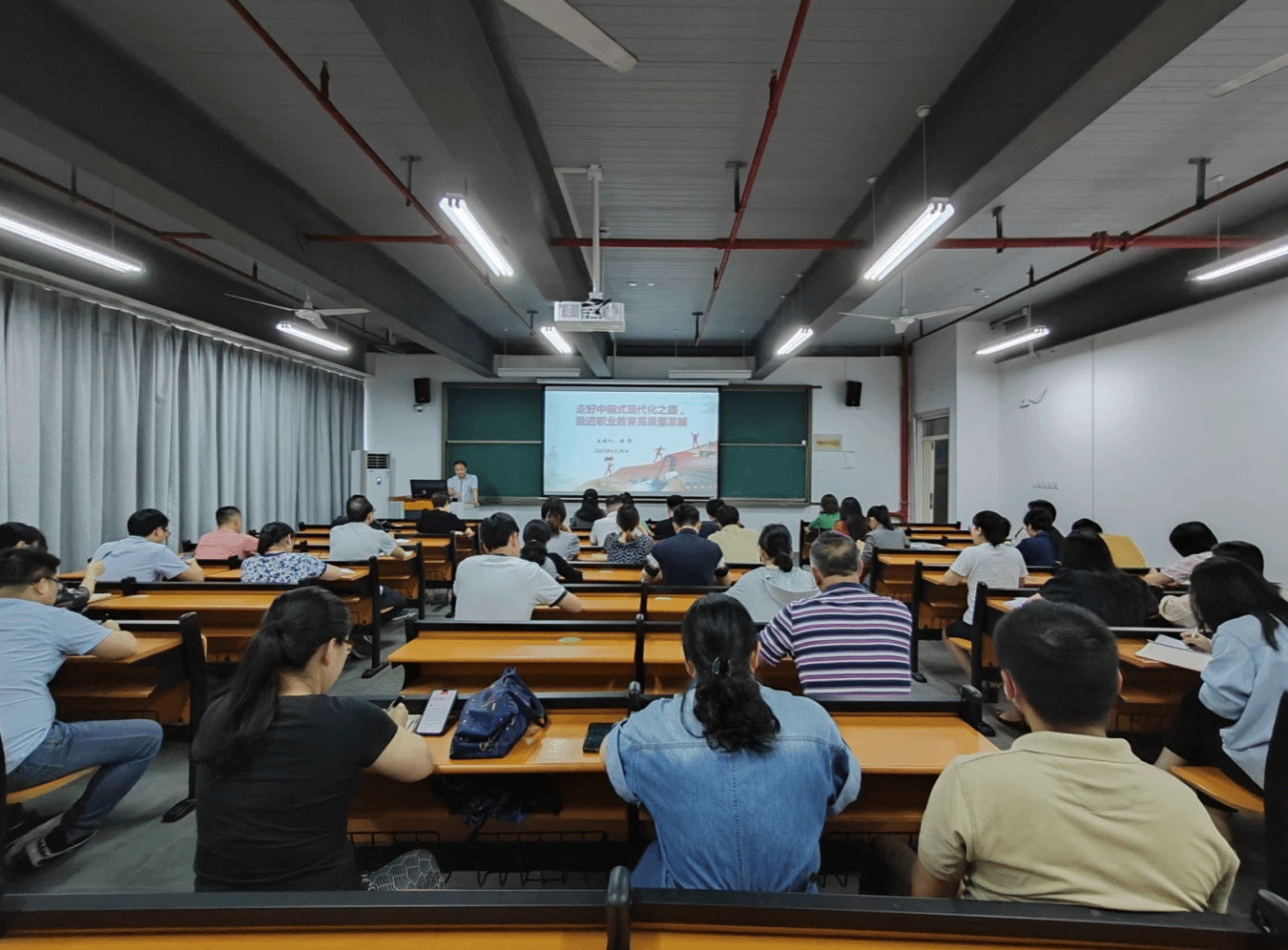 梁伟副校长以“走好中国式现代化之路,推进职业教育高质量发展”为主题,从中国式现代化这条道路出发,对“接续奋斗,追求千年梦想 ”“立足国情,开辟全新道路”“踔厉奋发,推进职业教育高质量发展 ”三个方面内容进行了深入浅出的阐述。他强调,在学校发展的关键时期,我们既要通过理论学习来实现“学思想、强党性”,又要通过调查研究来达到“重实践、建新功”。一要坚持读原著、学原文、悟原理,加强对业务知识的学习,不断充实、拓展、提高自己,增强自身本领,为提升学校教育教学质量提供强大动力。二要以立德树人为根本任务,把专业(群)建设、课程建设、师资建设和基地建设四个直接要素、校企合作与信息技术两个重要节点,与治理体系这个必要保障结合起来,为学校发展奠定基础。