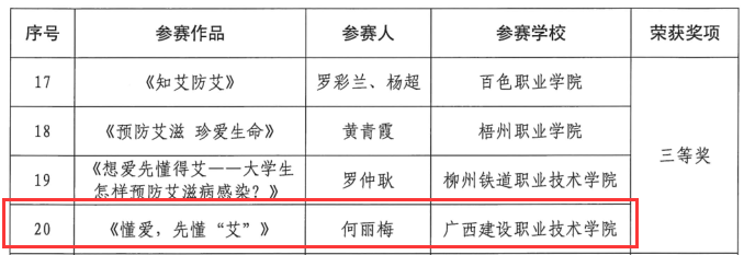 伟德国际1946源于英国7月14日讯(党委学生工作部 周晓卉)近日,在自治区卫生健康委、自治区教育厅举办的广西职业院校艾滋病防治宣传教育系列活动中,伟德国际官网荣获优秀组织奖。同时,伟德国际官网何丽梅老师在“我是防艾卫士”微课比赛中荣获三等奖;伟德国际官网老师指导学生作品在“你我来防艾”短视频征集大赛中分别荣获三等奖1项、优秀奖9项。