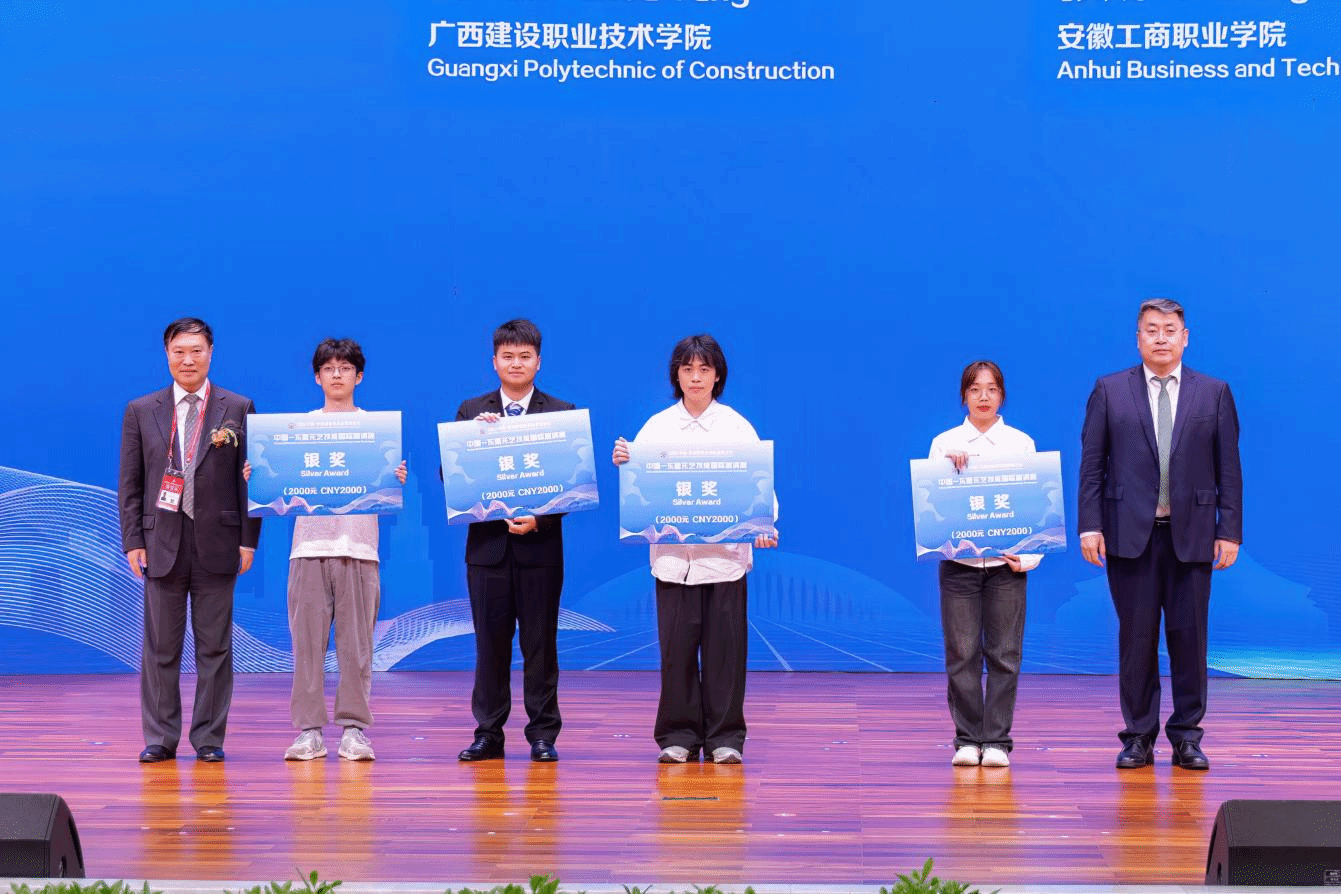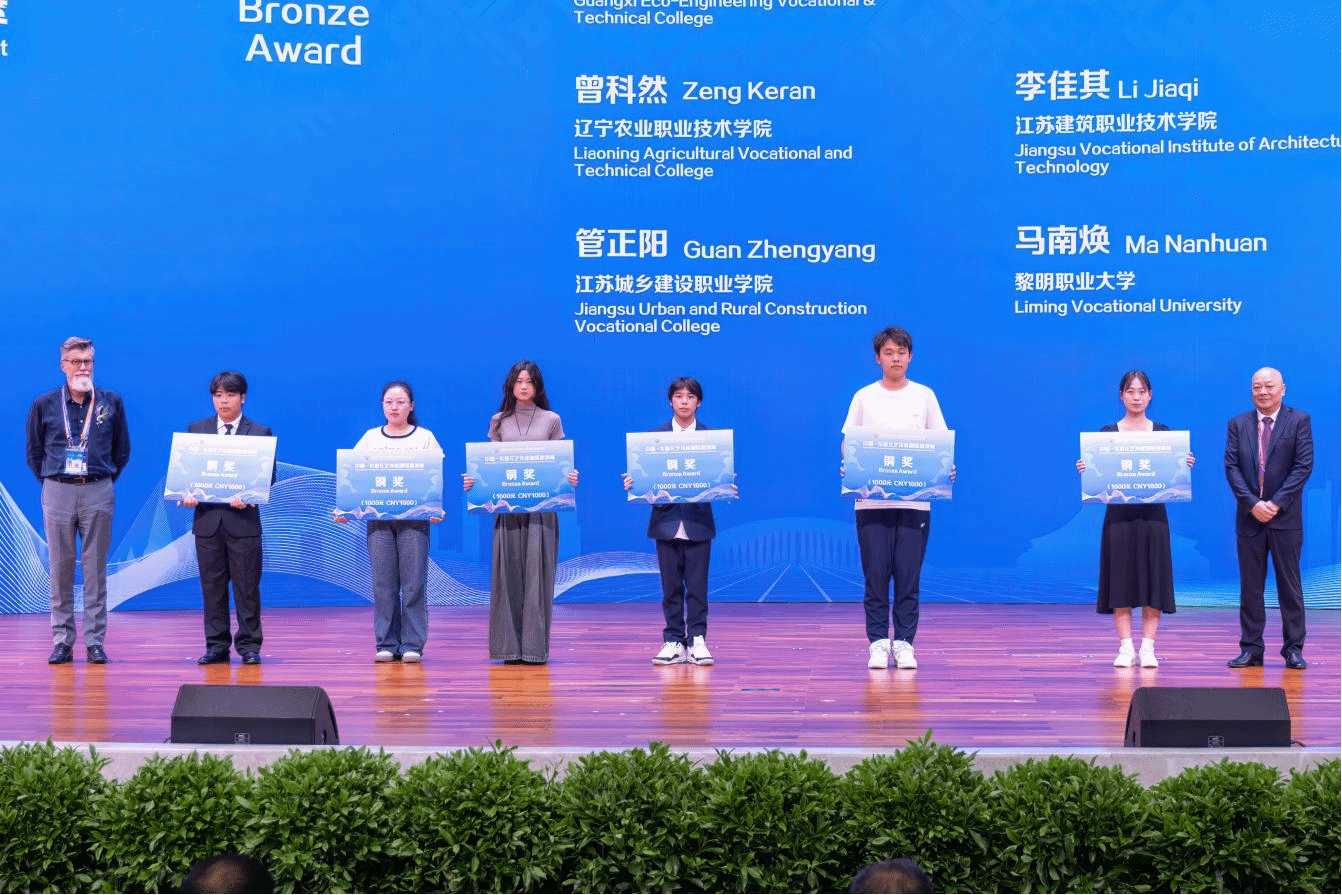 住房和城乡建设部人事司一级巡视员何志方,全国住房和城乡建设职业教育教学指导委员会副主任委员兼秘书长程鸿为获银奖的参赛选手颁奖