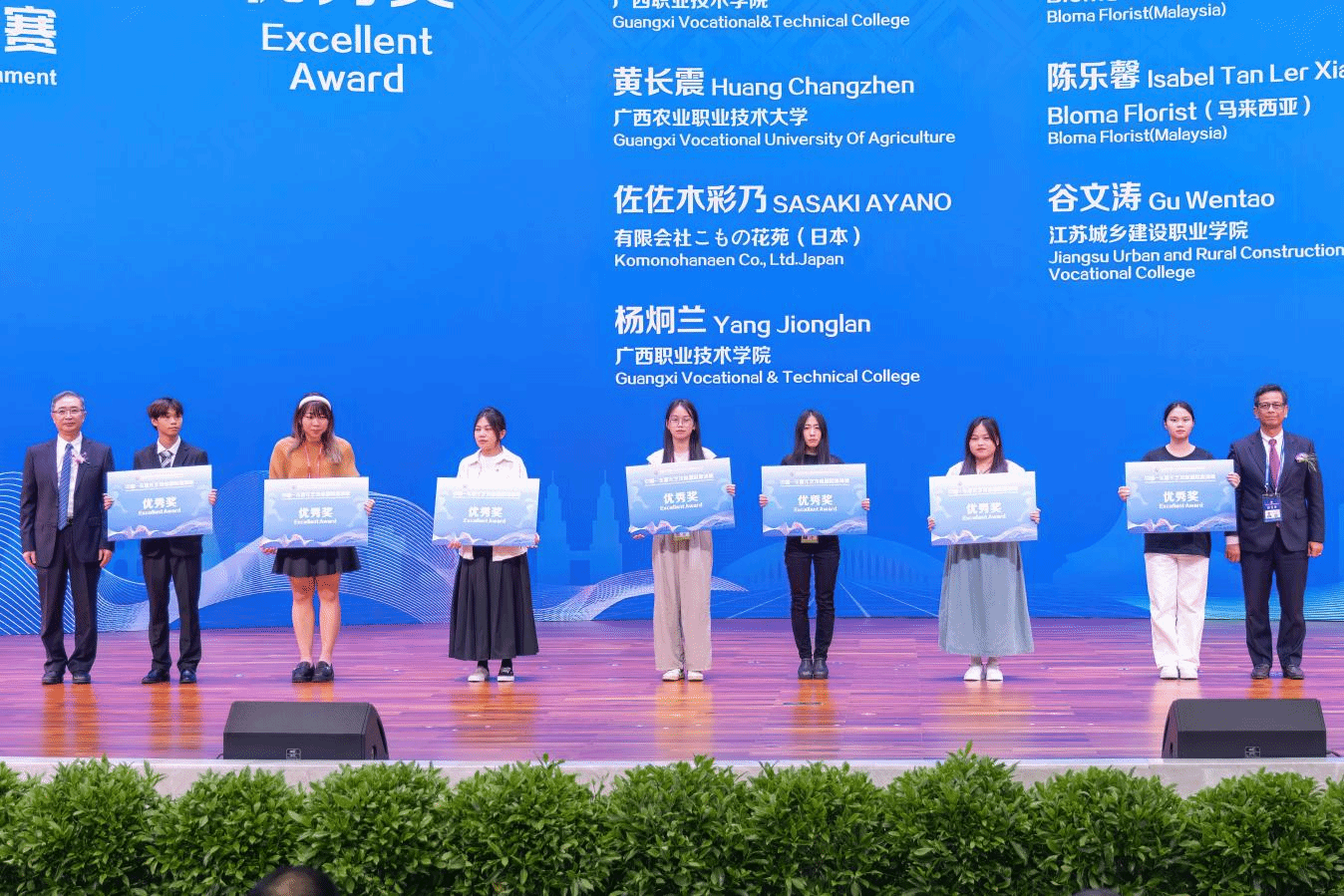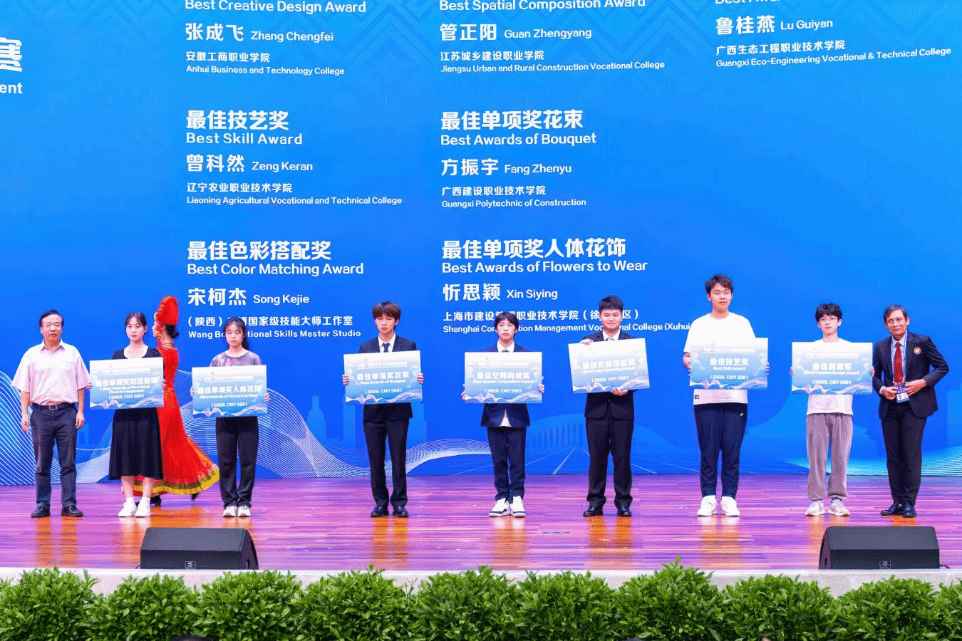 在为期两天的比赛中,选手们沉着冷静,根据赛事要求创作完成了三个模块的花艺作品,将创意、技艺、色彩搭配和空间构成完美结合,展现出了扎实的专业功底、出色的技能水平和优秀的文化素养,为大家献上了一场精彩的“花艺对决”,给“绿城”南宁和伟德国际1946源于英国带来了一场花艺盛宴。裁判组坚持“公平、公正、公开”的原则,严格执裁、认真负责,圆满完成了赛事的执裁工作,保证了赛事的成功举办。经过激烈的角逐和技能比拼,共评选出金奖2项、银奖4项、铜奖6项,优秀奖和单项奖共14项,2名教师获优秀指导教师。与会领导为获奖选手、优秀指导教师颁奖。