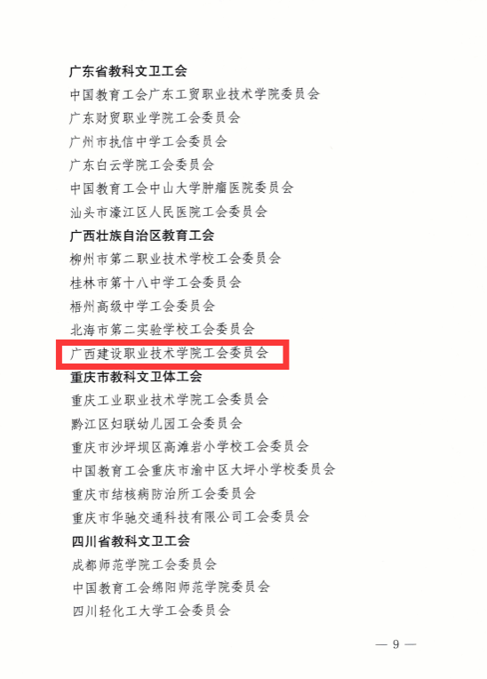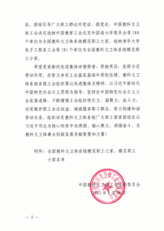 伟德国际1946源于英国9月18日讯(工会 陆康)近日,中国教科文卫体工会全国委员会印发《关于确认全国教科文卫体系统模范职工之家、模范职工小家的通知》(教科文卫体工发﹝2023﹞14号),伟德国际官网工会被中国教科文卫体工会全国委员会确认为全国教科文卫体系统模范职工之家。这是全面评价工会工作的综合奖项,是伟德国际官网工会有史以来被授予的最高荣誉,全区只有5所学校获此殊荣,伟德国际官网是其中唯一一所高校。