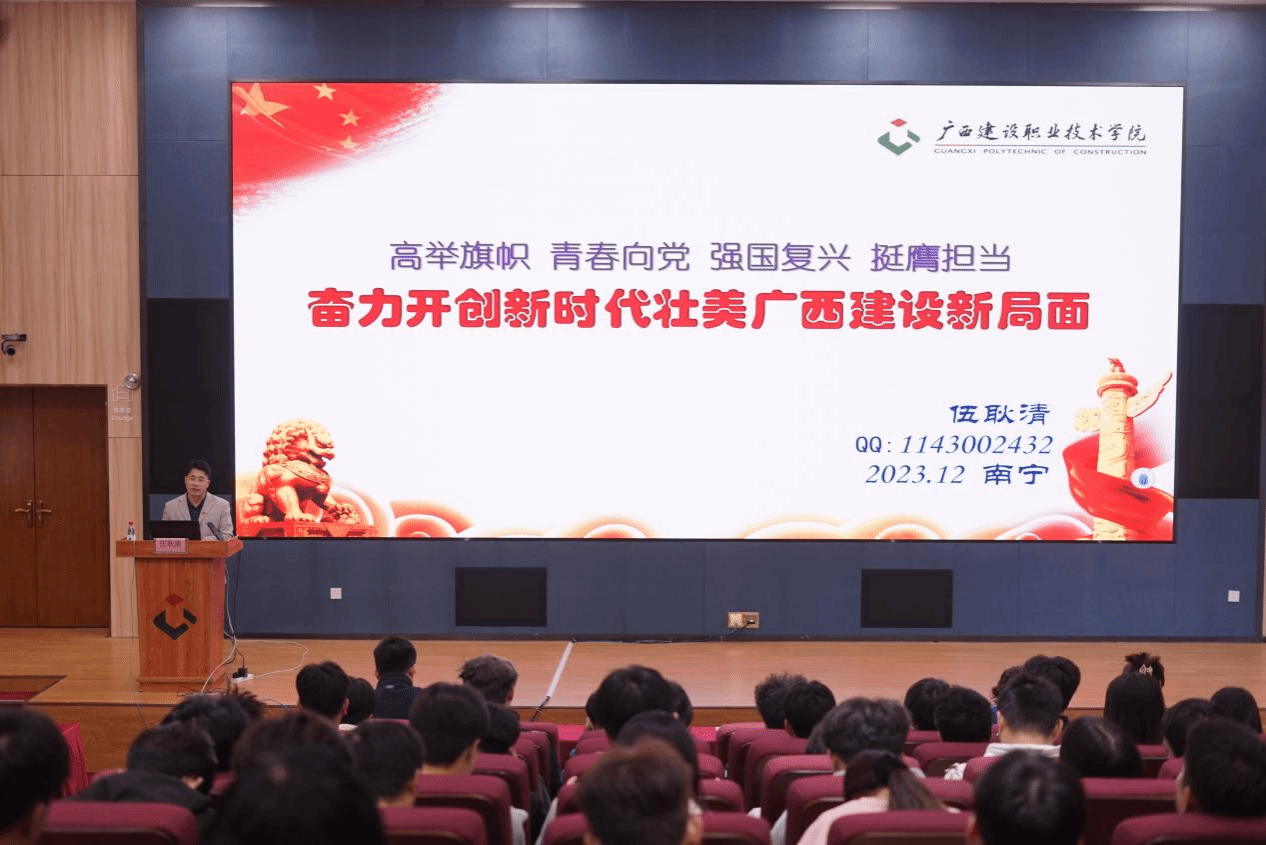 团课上,伍耿清副校长以《“高举旗帜青春向党,强国复兴挺膺担当”——奋力开创新时代壮美广西建设新局面》为题,以学习习近平总书记同团中央新一届领导班子成员集体谈话时的重要讲话精神和团十九大精神为开篇,重点围绕“三大定位新使命”“五个扎实新要求”“壮美广西新愿景”“四个新总要求”“五个更大重要要求”等5个方面内容进行理论宣讲,并就团员和青年关注的热点问题进行释疑解惑。