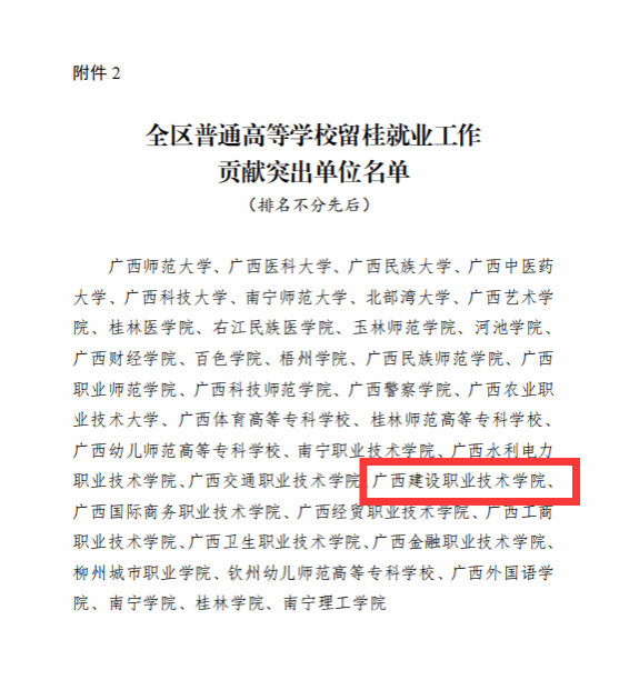 伟德国际1946源于英国12月29日讯(招生就业处 覃春华)近期,自治区教育厅下发《关于认定2023年全区普通高等学校就业创业工作突出单位和留桂就业工作贡献突出单位的通知》(桂教学生〔2023〕16号),伟德国际官网荣获“全区普通高等学校就业创业工作突出单位”“留桂就业工作贡献突出单位”荣誉称号。