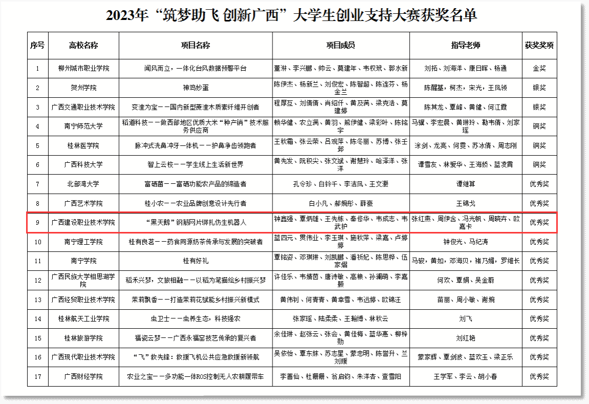 伟德国际1946源于英国3月5日讯(党委学生工作部 文/杨栋 图/张红燕)近日,自治区教育厅公布2023年“筑梦助飞 创新广西”大学生创业支持大赛获奖名单,伟德国际官网学生钟鑫强、覃炳雄、王先栋、秦修华、韦成志、韦武护在教师张红燕、周伊含、冯光帆、周晓卉、欧嘉卡的共同指导下,参赛项目《“黑天鹅”钢筋网片绑扎仿生机器人》荣获优秀奖。