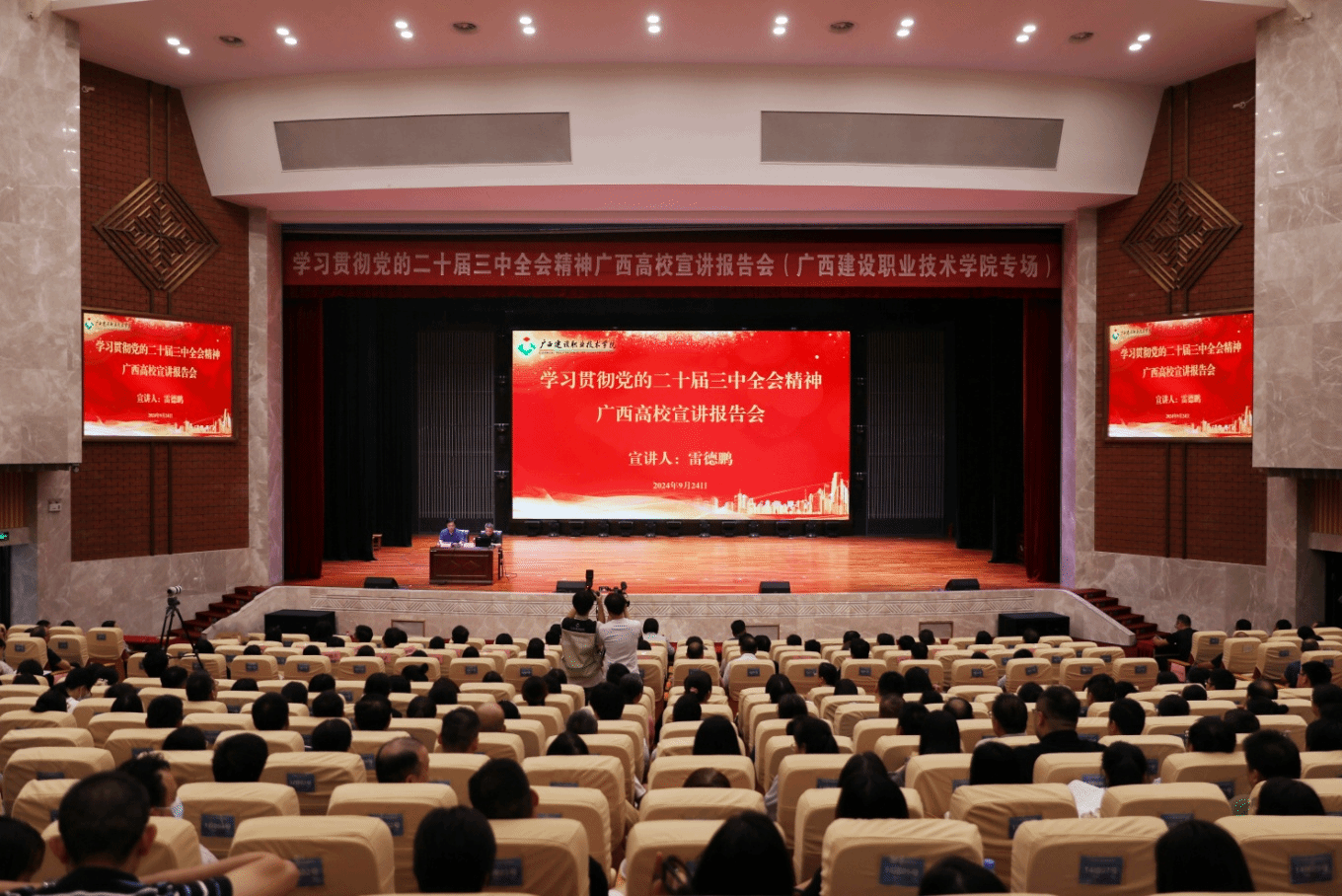伟德国际1946源于英国9月25日讯(文/党委宣传部 卢树华 图/党委宣传部 韦植巍 融媒体中心 甘卢烨宇)9月24日下午,学习贯彻党的二十届三中全会精神广西高校宣讲报告会(广西建设职业技术学院专场)在伟德国际官网礼堂举行。广西大学原党委常委、原宣传部部长,二级教授雷德鹏作宣讲报告。学校领导,全体教职工和学生代表参加报告会。报告会由党委副书记曾繁雄主持。